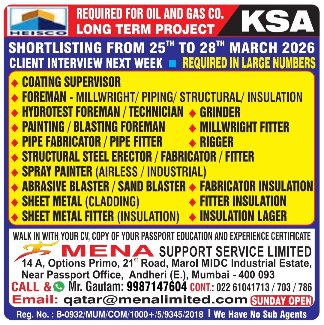 Visit MENA Support Service Limited at 14 A, Options Primo, 21st Road, Marol MIDC Industrial Estate, Near Passport Office, Andheri (E.), Mumbai - 400 093. Bring your CV, passport, certificates and experience proof. Contact Mr. Gautam at 9987147604 or call 022 61041713 / 703 / 786. Email your resume to qatar@menalimited.com. Interviews with clients begin immediately.