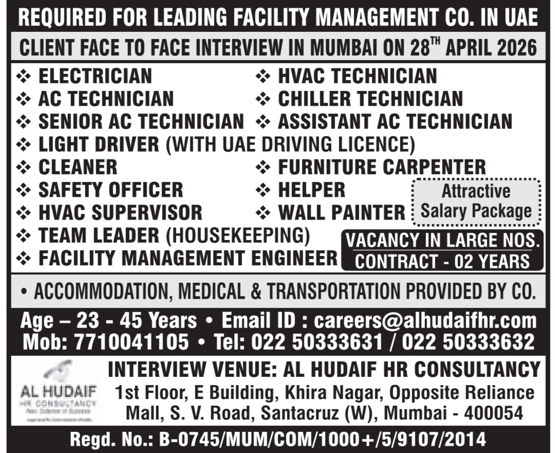 Candidates between 23-45 years old can apply now. Contact Al Hudaif HR Consultancy at 7710041105 or email careers@alhudaifhr.com with your resume. Interviews take place at 1st Floor, E Building, Khira Nagar, Opposite Reliance Mall, S.V. Road, Santacruz (W), Mumbai - 400054 on 28th April 2026. All selected staff get 2-year contracts with free accommodation, medical benefits, and transport.