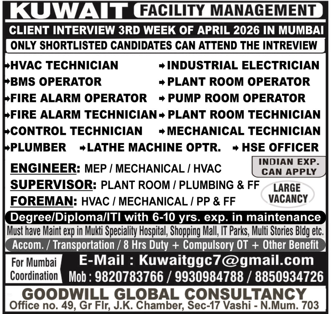 Goodwill Global Consultancy is launching a major recruitment campaign for skilled maintenance professionals to work in Kuwait. The direct client interview will take place in Mumbai during the 3rd week of April 2026.